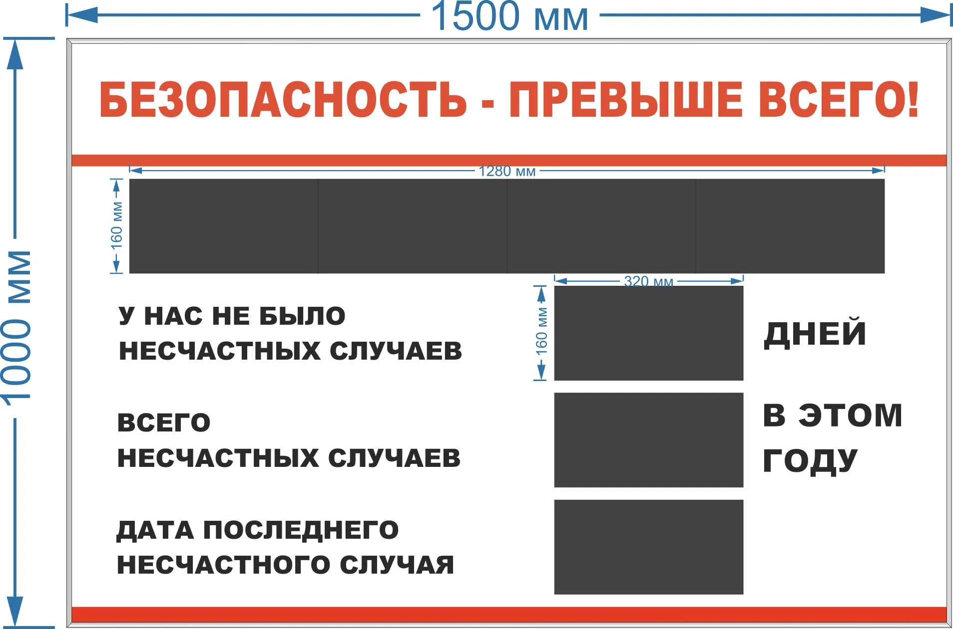 Информационное табло, с бегущей строкой, счетчиком дней, управление кнопочное с возможностью установки индивидуального значения в каждом окне, ежедневная смена значений автоматическая под управлением таймера, подсветка светодиодной лентой, блок питания (с 220 на 12 Вт), боковые стенки алюминиевый профиль шириной 90мм, задняя стенка металлокопозит 3мм, с элементами креплениями (две пары языков), лицевая часть оргстекло 3мм, УФ печать, размер стенда 1500х1000мм (программное обеспечение Ledshow TW 2013, USB -накопитель,